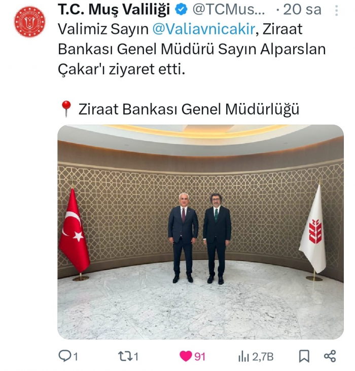 Ziraat Bankası Genel Müdürü Alparslan Çakar da, Muş Valisi Avni Çakır’ın ziyaretlerinden duyduğu memnuniyeti dile getirdi.