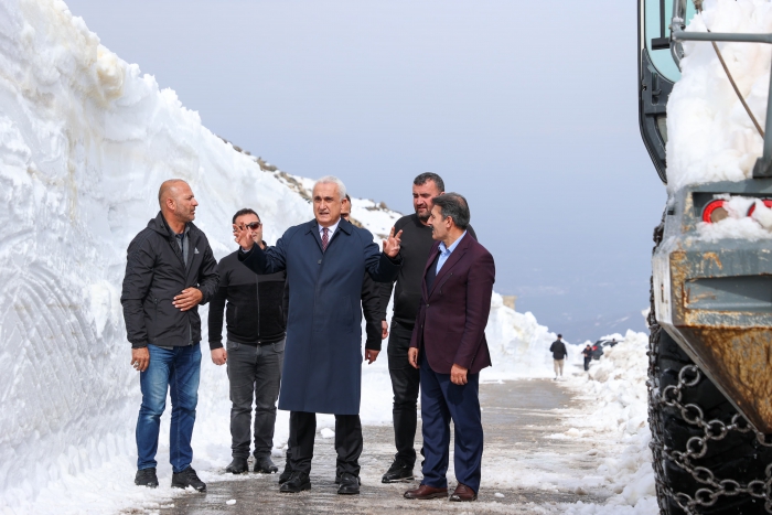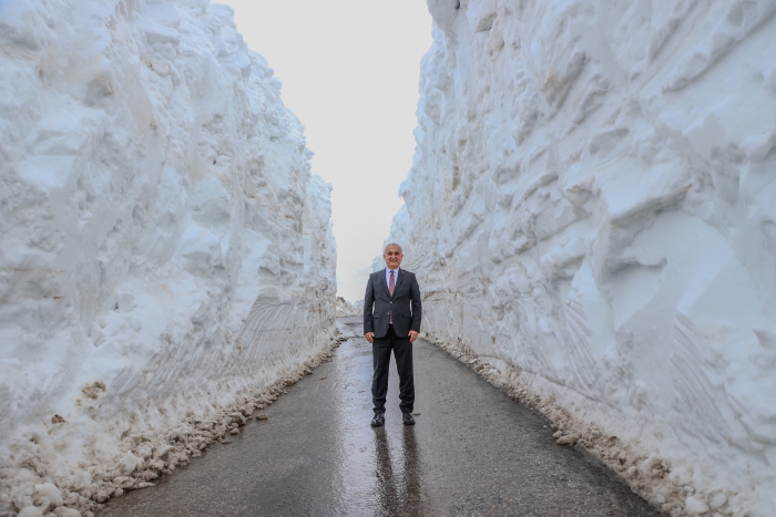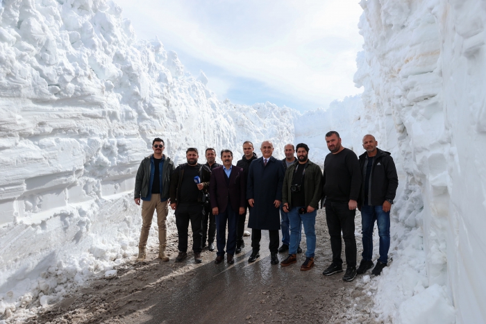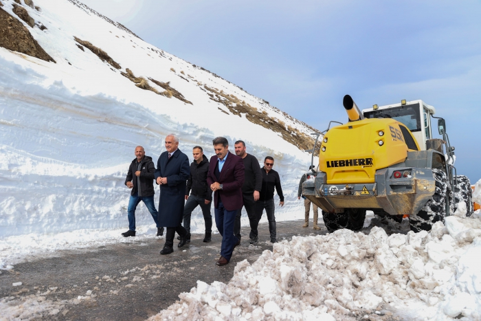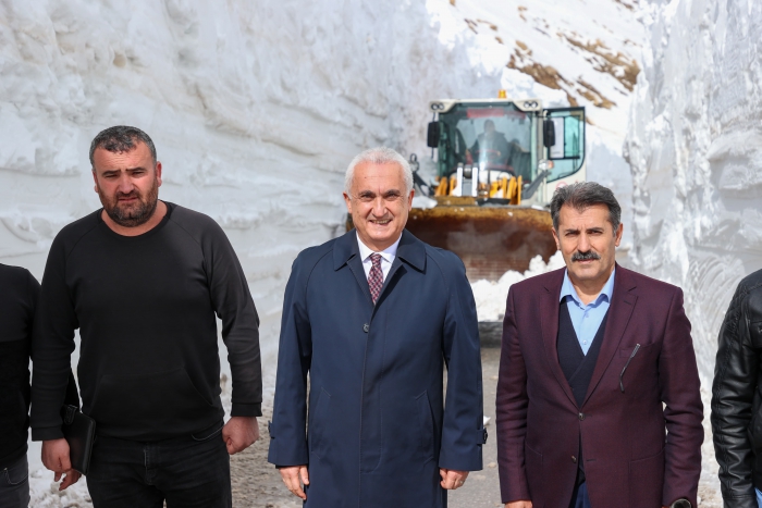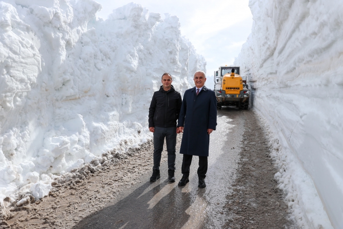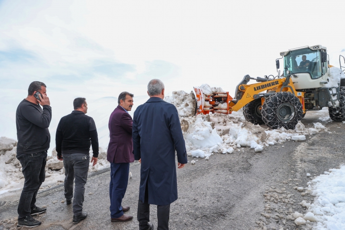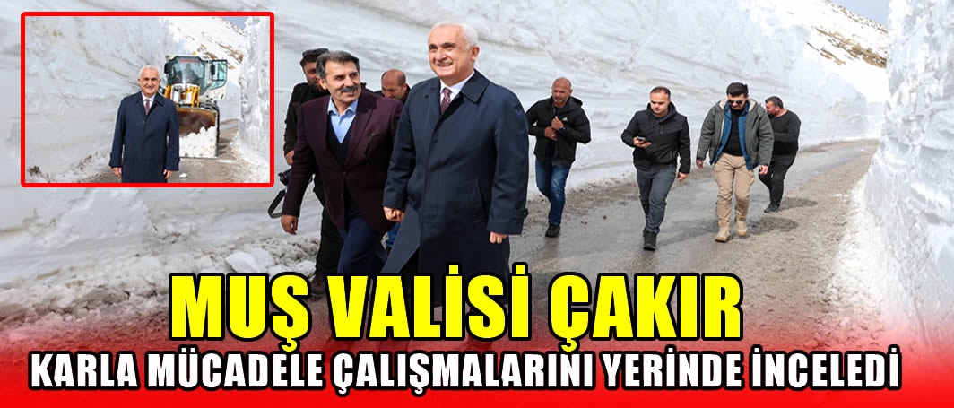 ALPARSLAN DİYARI- Muş Valisi Çakır, Üçevler grup köy yolunda yoğun kar yağışı sonucu oluşan 7 metrelik kar kalınlığında yol açma çalışması yapan kar kaplanlarını ziyaret etti.