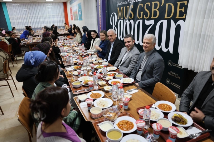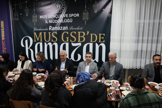 ALPARSLAN DİYARI- Muş Valisi Avni Çakır, eşi Bahar Çakır, Vali Yardımcısı Cihat Abukan ve Gençlik ve Spor İl Müdürü Yusuf Kılıç, GSB Muş Müştak Baba Yurdu’nda öğrencilerle aynı iftar sofrasında buluştu.