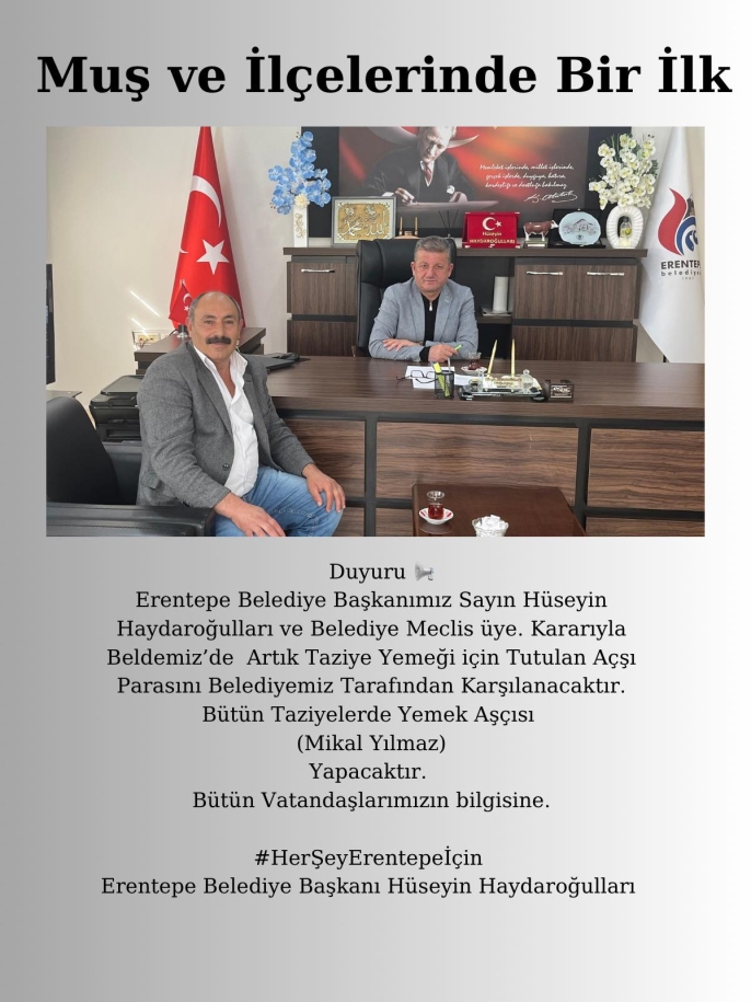ALPARSLAN DİYARI- Erentepe Belediye Başkanı Hüseyin Haydaroğulları ve Belediye Meclis Üyeleri’nin aldığı kararla, artık belde genelinde düzenlenen taziye yemeklerini yapan aşçı belediye tarafından karşılanacak.