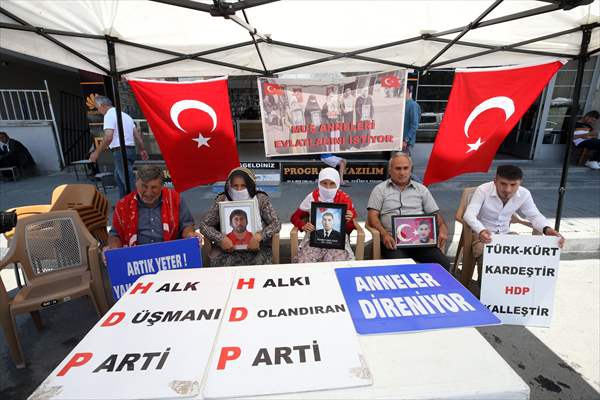 Muş'ta bir araya gelen aileler, çocuklarının terör örgütü PKK tarafından dağa götürülmesinden sorumlu tuttukları HDP'nin il başkanlığı önünde oturma eylemi yaptı.