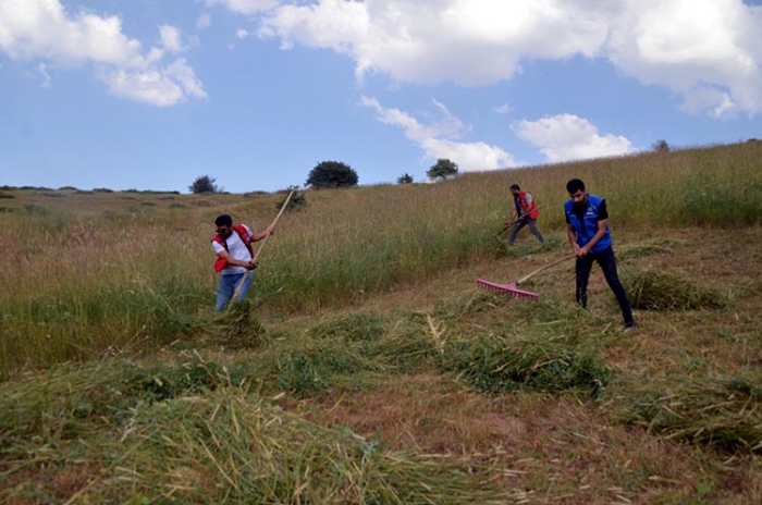 Merkezdeki gönüllüler olarak 13 kişilik bir ekiple kurumaya yüz tutan otları biçtiklerini anlatan Çiçek, "Bu şekilde hem gençlerin iyilik alışkanlığını geliştiriyoruz hem de gençler arasında yardımlaşma duygusunu artırıyoruz. Arazi engebeli olduğu için traktörle otu biçmek mümkün olmadı. Gönüllü erkekler tırpanla otu biçerken, kadınlar da tırmıkla topladı." dedi.