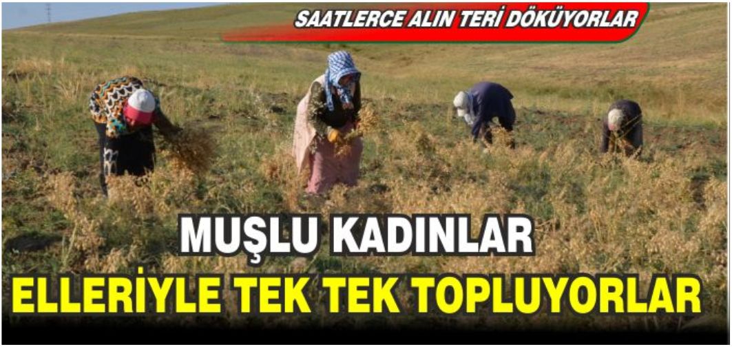 ALPARSLAN DİYARI- Muş'un Yaygın beldesinde bir grup kadın, aile bütçelerine destek olabilmek için güneş altında günde en az 10 saat elleri ile nohut biçiyor. Kadınlar sabahın erken saatlerinde başladıkları mesailerini gün batımında tamamlıyor.