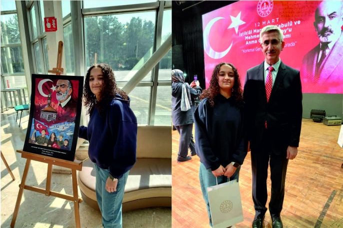 “Adını Mehmet Akif Ersoy’dan Alan Okullar” kategorisinde yarışan Mehmet Akif Ersoy İmam Hatip Ortaokulu öğrencisi Elif Damla Miroğlu, hazırladığı eserle jüri üyelerinden tam not alarak Türkiye birincisi oldu. Milli şair Mehmet Akif Ersoy’un mirasını ve İstiklal ruhunu tuvaline yansıtan öğrenci, ortaya koyduğu çalışmayla büyük takdir topladı.