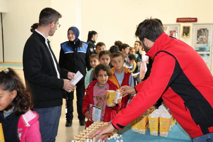 ALPARSLAN DİYARI- Muş İl Emniyet Müdürlüğü bünyesinde görevli polis memurları, kentteki okullarda eğitim öğretim gören öğrencilere "İyi Seyirler Projesi" kapsamında sinema etkinliği düzenliyor. Her hafta değişik okullardan yüzlerce çocuğu sinema ile buluşturan Muş Emniyet Müdürlüğü, öğrencilere unutulmaz anlar yaşatıyor. Sinema etkinliğine katılan ve keyifli vakit geçiren çocuklar zaman zaman da polis ekiplerine mektup yazarak teşekkür ediyor.