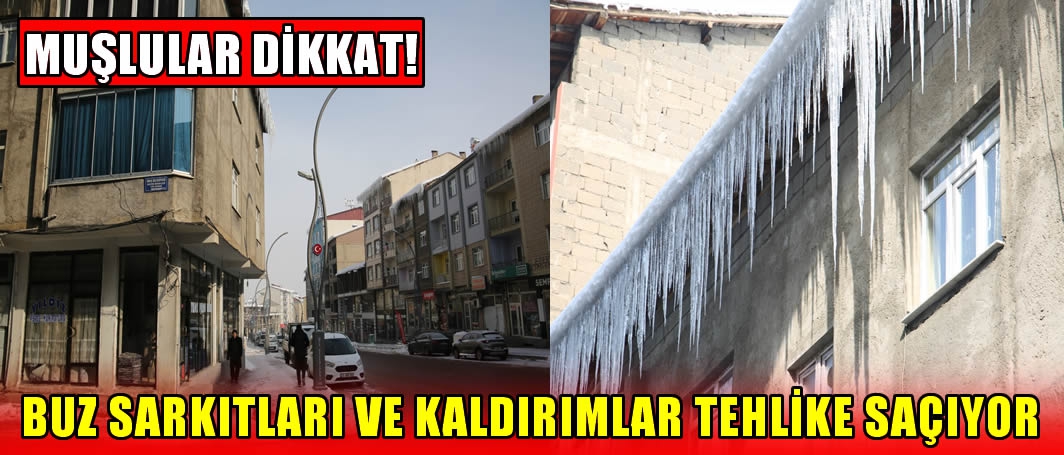 Muş’ta çatılarda oluşan buz sarkıtları yayalar için büyük tehlike oluşturuyor. Yetkililer, soğuk havaların devam edeceğini belirtirken, çatılarda oluşan buz sarkıtları nedeniyle vatandaşların dikkatli olması gerekiyor.