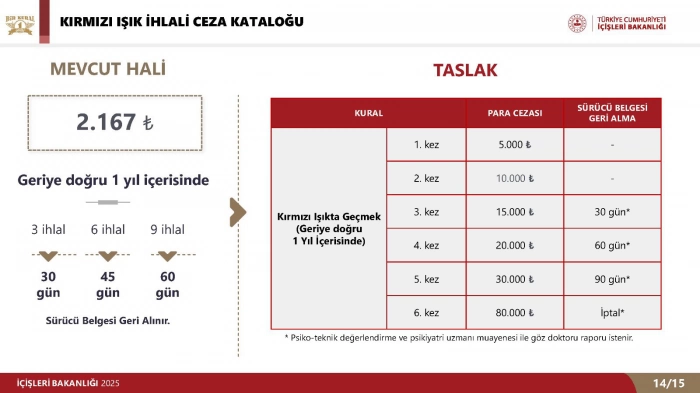 ALPARSLAN DİYARI- Mevcut durumda kırmızı ışıkta geçme cezası 2.167 TL iken, İçişleri Bakanı Ali Yerlikaya tarafından sunulan yeni taslak