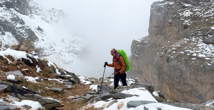 Zorluklara rağmen yürüyüşlerinden vazgeçmeyen dağcılar, saatler süren seyahatlerinin sonunda hedeflerine ulaşmayı başarıyor.
