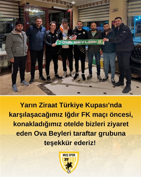 Ziyaretle ilgili Muşspor’dan yapılan açıklamada, “3 Aralık Salı günü Ziraat Türkiye Kupası’nda karşılaşacağımız Iğdır FK maçı öncesi, konakladığımız otelde bizleri ziyaret eden Ova Beyleri taraftar grubuna teşekkür ederiz!” denildi.