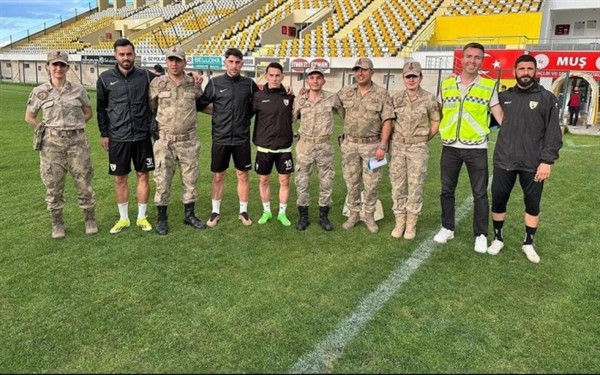 Muşsporlu oyuncular antrenmanlarına devam ederken İl Jandarma Komutanlığı'ndan bir heyet antrenman sahasına geldi. Bu beklenmedik ziyaret, futbolcular ve teknik heyet arasında şaşkınlık ve sevinç oluşturdu.