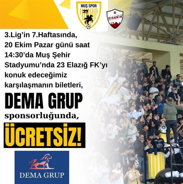 ALPARSLAN DİYARI- Lig'in 7. Haftasında, Muşspor yarın, 20 Ekim Pazar günü saat 14:30'da Muş Şehir Stadyumu'nda 23 Elazığ FK'yı ağırlıyor. DEMA GRUP'un sponsorluğunda, bu önemli maçın biletleri ücretsiz olarak taraftarlara sunuluyor!