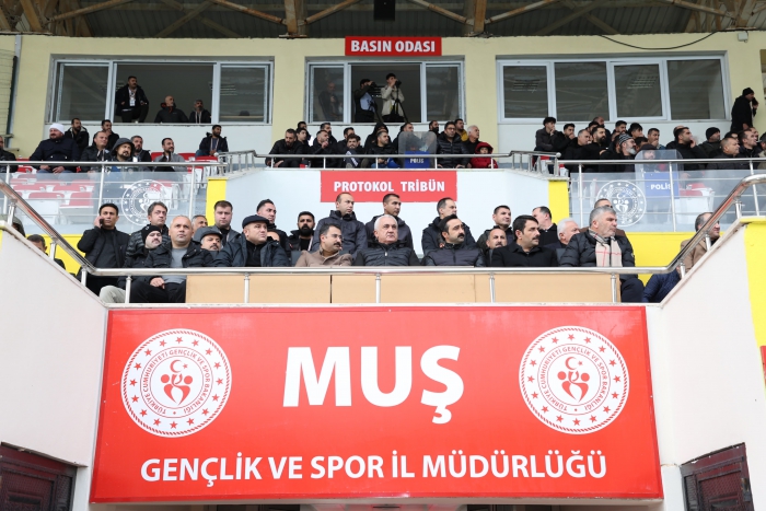 Muşspor’un Sultanbeyli Belediye Spor’u 6-0 mağlup ettiği maça protokol üyeleri de yoğun ilgi gösterdi. Geçmiş maçlarda olduğu gibi bu maçta da Muşspor’a destek vermek amacıyla protokol tribünündeki yerlerini alan Muş Valisi Avni Çakır ve Muş Belediye Başkan Vekili Muhterem Bozkurt, Cumhuriyet Başsavcısı Hüseyin Kantar, Muş Ağır Ceza Mahkemesi Başkanı İbrahim Karlı, Muş Emniyet Müdürü Serkan Karaman, Vali Yardımcıları Hasan Taş, Mustafa Batuhan Alpboğa, Cihat Abukan ve kamu kurum müdürleri ile çok sayıda kişi maçı protokol tribününden takip ederek Muşspor’a destek oldular.