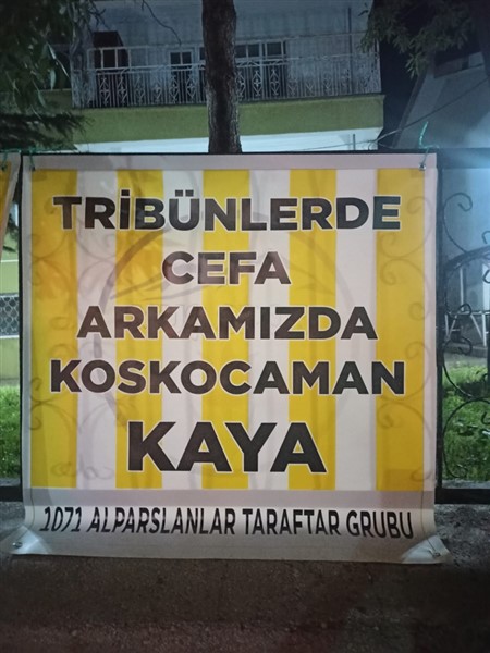Asılan pankartlarda, “Güç parada değil yürektedir, o yürek sadece sendedir. Alparslan ruhuyla KAYA gibi dimdik ayakta. Taş üstüne taş koysan da bir KAYA etmez. Şampiyonluklar bahane, biz seni sevdik gerisi hikaye. Yaptıkların için minnettarız ama yapılacak işimiz çok. Muşspor’un geleceği KAYA. Dön de bak şu tribüne senin kadar sevilen var mı?. Tribünlerde cefa, arkamızda koskocaman KAYA.” ifadeleri yer aldı.