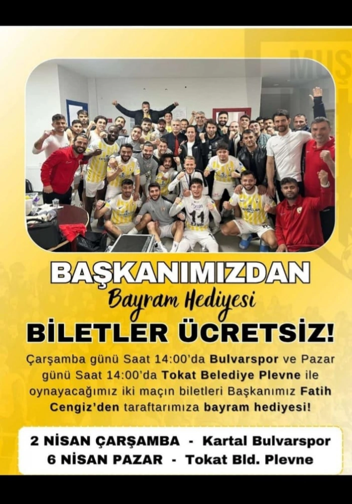 Muşspor, taraftarlarına bayram hediyesi olarak, bu iki maçı ücretsiz izleme imkanı sunuyor. Kulüpten yapılan açıklamaya göre, evinde oynayacağı her iki maçta da bilet ücreti alınmayacak. Taraftarlar, takımlarına destek olmak ve maçları ücretsiz izlemek için stadyuma davet ediliyor.