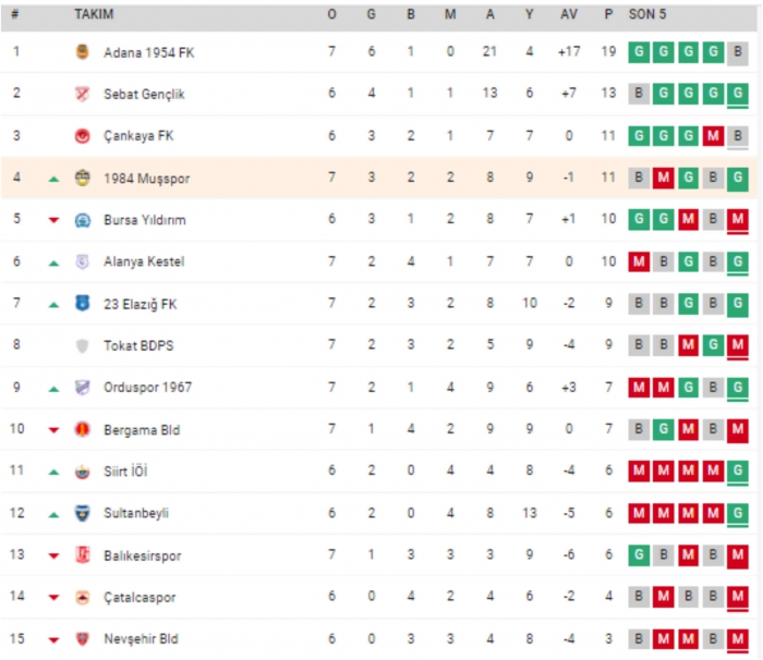 ALPARSLAN DİYARI- TFF 3. Lig'de 7. hafta müsabakaları tamamlandı. 4. Grup’ta mücadele eden Muşspor bu hafta 4. Sırada yer aldı. Grup lideri Bitexen Adana 1954 F.K 19 puanda yer alıyor. Adana ekibinin lig ikincisine 6 puan fark attığı görülüyor.