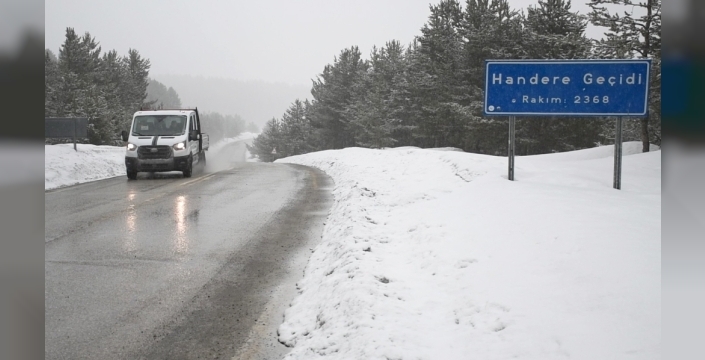 Özellikle ilçeye 15 kilometre mesafede bulunan 2 bin 368 rakımlı Handere Geçidi'nde kar yağışı sürücülere zorlu anlar yaşattı. Yollarda oluşan kar birikintileri, ulaşımda aksamalara neden olabilecek bir tablo çizdi.