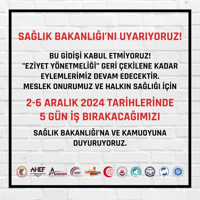 "Sağlık Bakanlığı'nı Uyarıyoruz Bu gidişi kabul etmiyoruz. ‘Eziyet Yönetmeliği’ geri çekilene kadar eylemlerimiz devam edecektir. Meslek onurumuz ve halkın sağlığı için; 2-6 Aralık 2024 tarihlerinde 5 gün iş bırakacağımızı Sağlık Bakanlığı'na ve kamuoyuna duyuruyoruz."