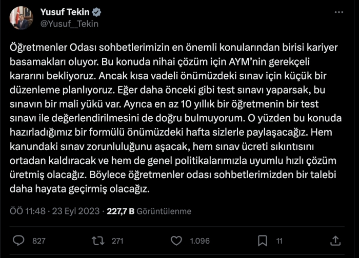 "Öğretmenler Odası sohbetlerimizin en önemli konularından birisi kariyer basamakları oluyor. Bu konuda nihai çözüm için AYM’nin gerekçeli kararını bekliyoruz. Ancak kısa vadeli önümüzdeki sınav için küçük bir düzenleme planlıyoruz. Eğer daha önceki gibi test sınavı yaparsak, bu sınavın bir mali yükü var.