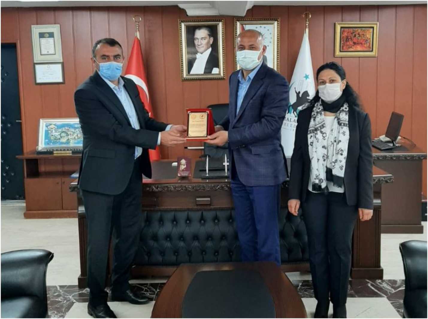 Malazgirt Şehit Kaymakam Muhammed Fatih Safitürk Ortaokulu Müdürü ve Okul Aile Birliği Başkanı tarafından Malazgirt Belediye Başkanı Cengiz Altın’a okullarına yapılan boya ve temizlik çalışmalarına verdikleri desteklerden dolayı teşekkür ziyaretinde bulundular.