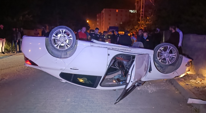 Ters dönen araçta sıkışan sürücü, itfaiye ekiplerince çıkarıldı.