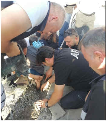 Gedikli'nin bacağı, borunun etrafındaki parke taşları kırılarak çıkarıldı.