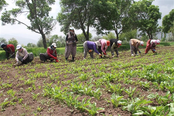 Erzincan'da pancar tarlasında çapa yapan kadın tarım işçileri, 300 lira yevmiyeyle çalışıyor.