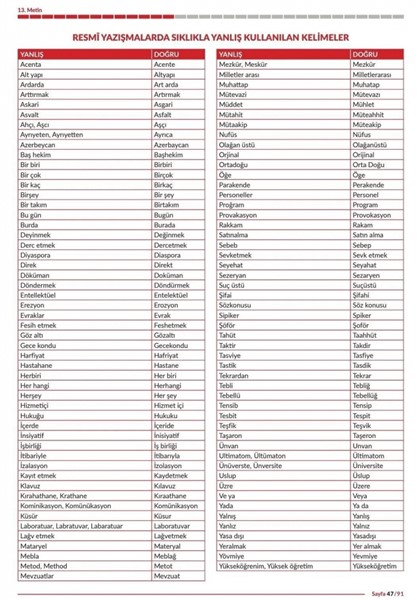 ALPARSAN DİYARI- Cumhurbaşkanlığı İdari İşler Başkanlığı, resmi yazışmalarda en sık yapılan yazım hatalarını içeren bir liste yayınladı. Listede, “Ünüversite”, “Tahüt”, “Yalnız”, “Yalnış”, “Yada”, “Sebeb”, “Tesbit”, “Rakkam”, “Taktir” gibi kelimelerin yanlış yazımları dikkat çekiyor.