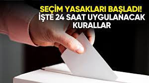 Yarın gerçekleştirilecek Cumhurbaşkanlığı ikinci tur seçimleri öncesi propaganda yasağı saat 18.00 itibarıyla başladı. Seçim günü saat 06.00'dan gece 00.00'a kadar alkollü içki satışı yasak olacak. Kıraathane, internet kafe gibi eğlence yerleri hizmet veremeyecek. İşte seçim yasakları ile ilgili tüm detaylar...