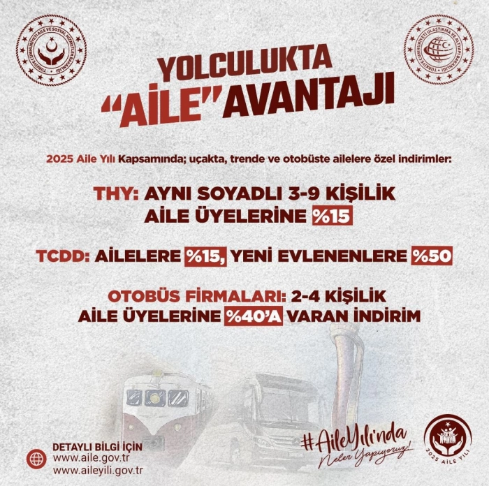 Yapılan açıklamada, ailece yola çıkmanın daha avantajlı olduğu belirtildi. Uçak, tren ve otobüs seyahatlerinde yüzde 15’ten yüzde 50’ye varan indirim sağlandığı kaydedildi.