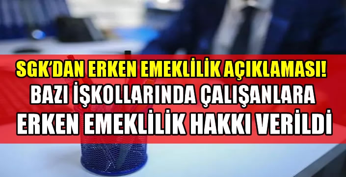 SGK’dan yapılan açıklamada, “6 Kasım 2023 tarihinde bazı basın yayın organlarında erken emeklilik hakkına sahip mesleklerin listesinin güncellendiği, listeye göre beş meslek grubu daha bu listenin içerisinde dahil edildiği, ağır çalışma koşulları nedeniyle bazı işkollarında çalışanlara erken emeklilik hakkının verildiği, Sosyal Güvenlik Kurumumuzca söz konusu listenin güncellenmesi sonucu maden işçileri, öğretmenler, havacılık sektörü ile kamu ve sağlık çalışanlarının da dahil edildiği ve belirlenen yaş haddinden önce emeklilik hakkı kazanabilecekleri ifade edilmiştir.