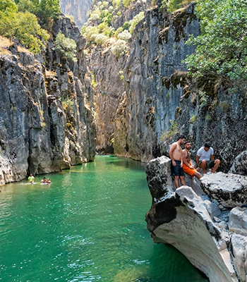 Doğayla iç içe zaman geçiren ziyaretçiler, dik kayalar arasındaki kanyonda kendilerini berrak sulara bırakarak serinliyor.