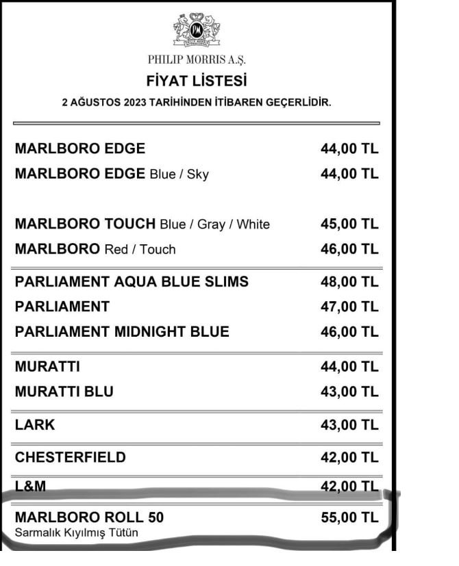 Bugün itibarıyle Philip Morris bünyesinde olan Marlboro grubu da fiyat artışlarına dahil oldu. Marlboro Roll 50 tütün fiyatı, önceki fiyatı olan 45 TL'den 55 TL'ye yükseldi.