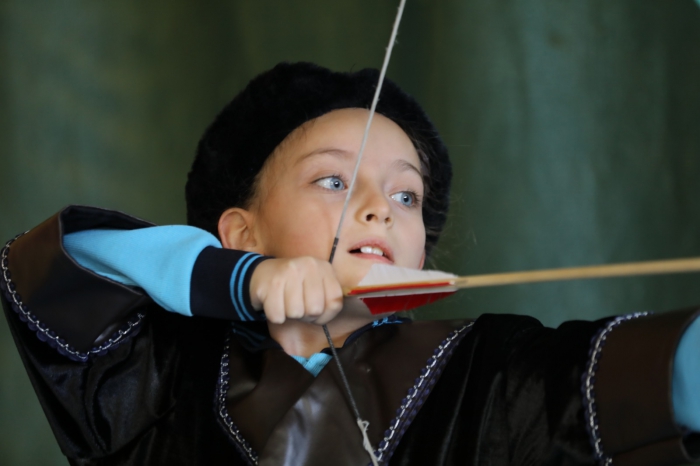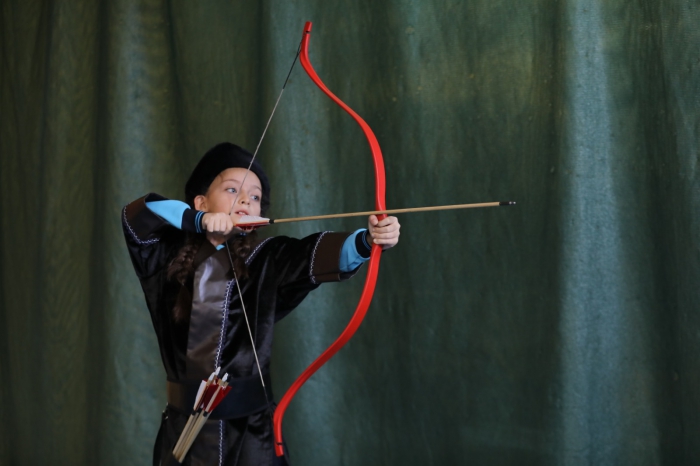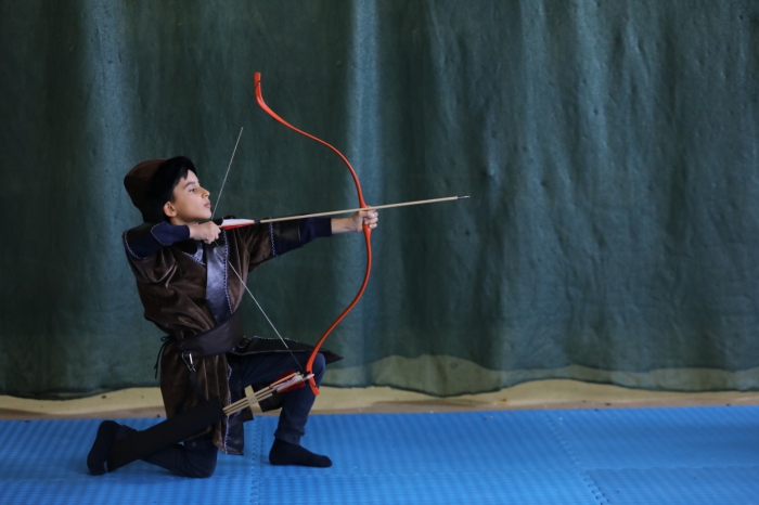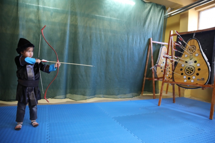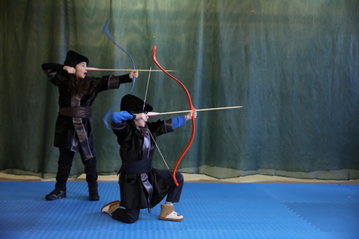 KENDİ TASARLADIĞI GELENEKSEL OKÇU KIYAFETLERİNİ KURSA KATILAN ÖĞRENCİLERE GİYDİRDİ