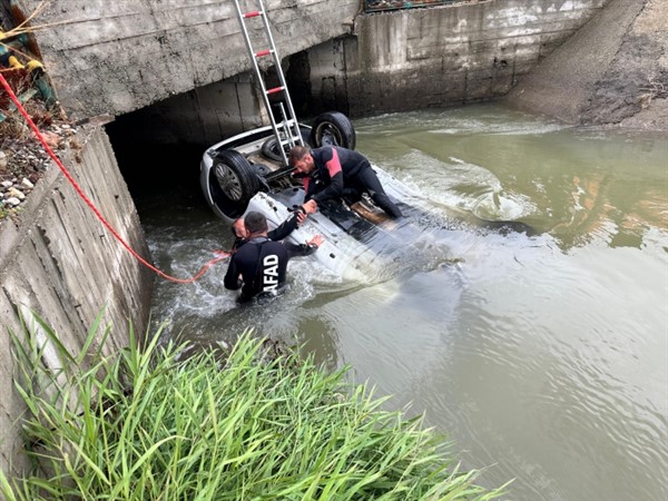 Otomobil, çekici yardımıyla su kanalından çıkartıldı.