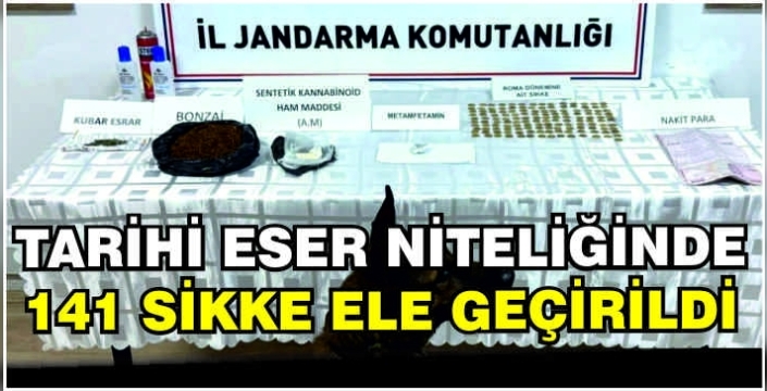 İkamet ve bahçesindeki aramada, 314 gram uyuşturucu ve tarihi eser niteliğinde olduğu değerlendirilen 141 sikke ile suçtan elde edilen 13 bin 800 lira ele geçirildi.