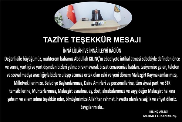 Değerli aile büyüğümüz, muhterem babamız Abdullah KILINÇ’ın ebediyete intikal etmesi sebebiyle definden önce ve sonra, yurt içi ve yurt dışından bizleri yalnız bırakmayarak bizzat cenazemize katılan, taziyemize gelen, telefon ve sosyal medya aracılığıyla bizlere ulaşıp acımıza ortak olan eski ve yeni dönem Malazgirt Kaymakamlarımıza, Milletvekillerimize, Belediye Başkanlarımıza, Daire Amirleri ve personellerine, tüm siyasi parti ve STK temsilcilerine, Muhtarlarımıza, Malazgirt esnafına, eş, dost, akrabalarımıza ve saygıdeğer Malazgirt halkına şahsım ve ailem adına teşekkür eder, ölmüşlerimize Allah’tan rahmet, hayatta olanlara sağlık ve afiyet dileriz.