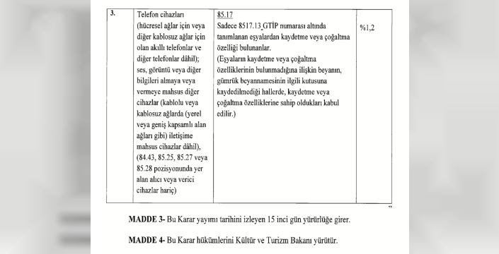 Yapılan yeni düzenlemeye göre, cep telefonlarından alınan ve halihazırda yüzde 1 olan Kültür ve Turizm Bakanlığı payı, yüzde 1,2'ye çıkarıldı. Bu yeni vergi oranının yürürlüğe giriş tarihi 3 Ocak 2026 olarak belirlendi. Dolayısıyla, bu tarihten itibaren satılan tüm sıfır cep telefonları yeni vergi oranı üzerinden fiyatlandırılacak.