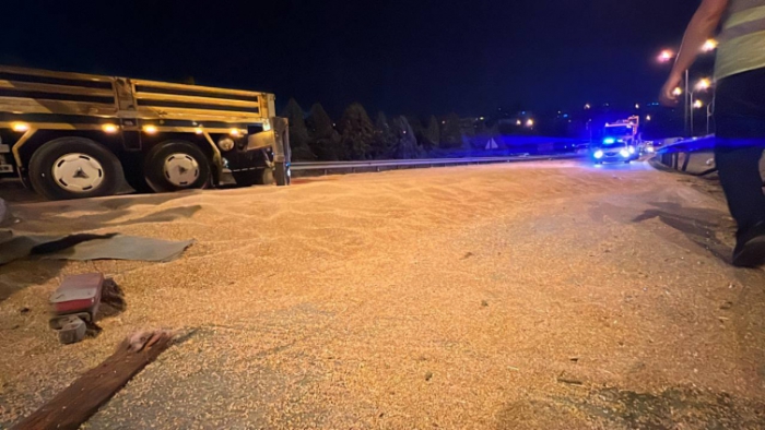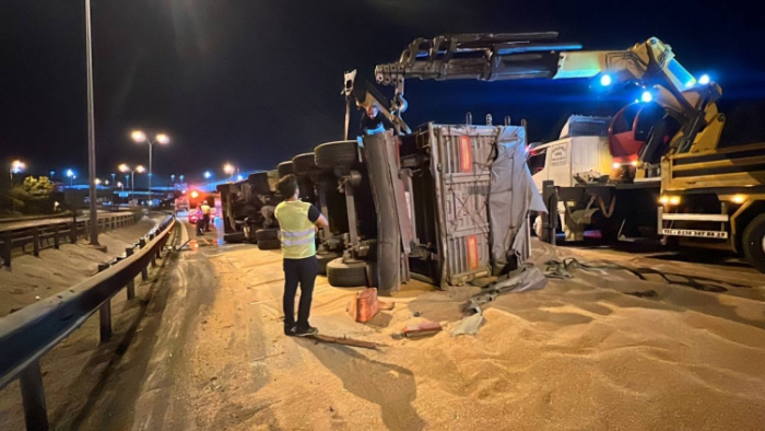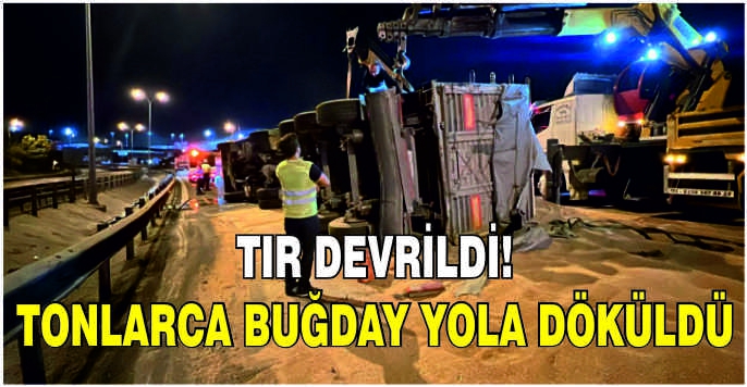 Tırın kasasındaki buğday yola savruldu, ekipler otoyolu trafiğe kapattı. Polis ekipleri, sürücüleri Dilovası gişelerine yönlendirdi.
