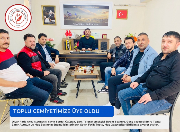 ALPARSLAN DİYARI- Kurulduğu günden bu yana toplumun her kesiminden ziyaretler alan Muş Gazeteciler Birliği üye sayısını da her geçen gün arttırıyor. Muş’ta gazetecilik faaliyetinde bulunan birçok gazeteciyi bünyesinde bulunduran Muş Gazeteciler Birliğine deneyimli gazeteci, Fatih Toplu da üye oldu. Muş’ta ilk kurulan Şark Telgraf Gazetesinin sahipleri arasında yer alan Fatih Toplu, faal olarak basılan Şark Haber Gazetesinin de sahipleri arasında yer alıyor.