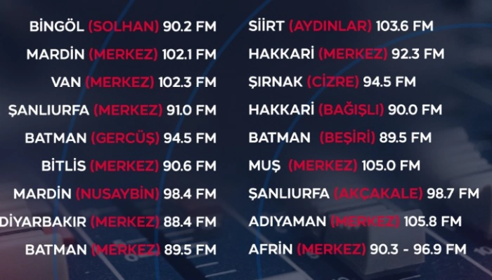 ALPARSLAN DİYARI- Doğu ve Güneydoğu Anadolu Bölgesi'nde geniş bir dinleyici kitlesine sahip olan TRT Kurdî Radyo'nun frekansları merak konusu olmaya devam ediyor. Kürtçe yayınlarıyla önemli bir yere sahip olan radyo, farklı şehirlerde farklı FM frekansları üzerinden dinleyicisiyle buluşuyor.