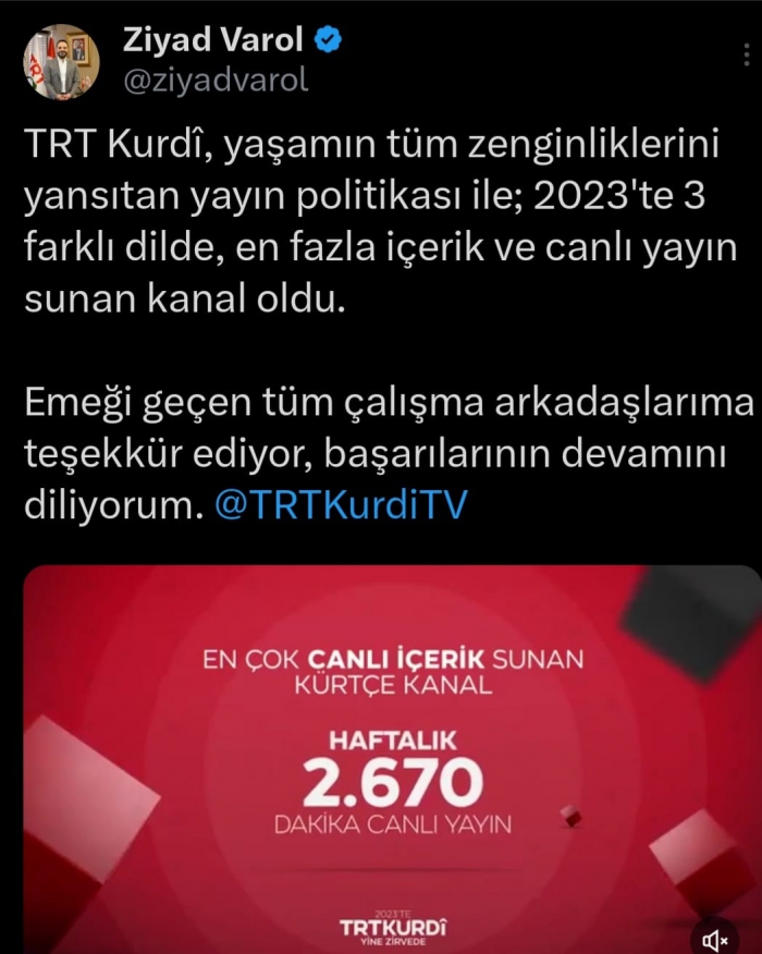 ALPARSLAN DİYARI- TRT Kurdi, 2023 yılında 3 farklı dilde en fazla içerik ve canlı yayın sunan kanal oldu.