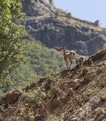 Yavrularıyla milli parktaki kayalıklarda gezinen yaban keçileri, belirli aralıklarla meşe ağaçları ve bitkilerle besleniyor.
