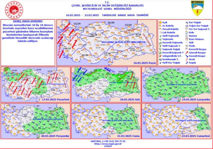 Meteoroloji Genel Müdürlüğü'nün tahminlerine göre; yurt genelinde sıcaklıklar 10-15 derece azalacak.