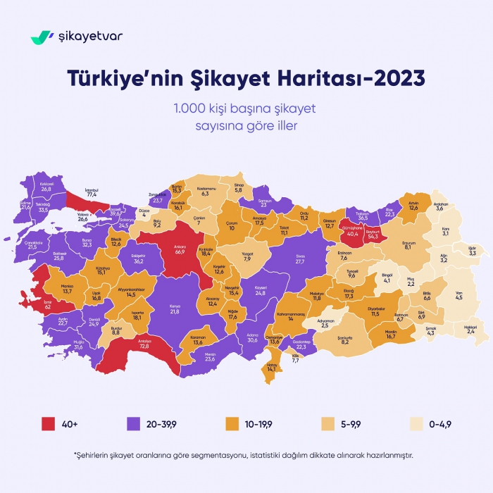 Nüfus ortalamasına göre 2023’te bin kişi başına düşen şikayet sayısı baz alındığında 77.4 şikayet yoğunluğuyla en çok şikayet eden şehir İstanbul oldu. İstanbul’u; Antalya, Ankara ve İzmir izledi. Şikayetvar verilerine göre geçmiş yıllarda olduğu gibi 2023’de Muş en az şikayet oluşturan il olarak kaydedildi. En az şikayetçi olan diğer iller Hakkari, Adıyaman ve Kars olarak sıralandı.