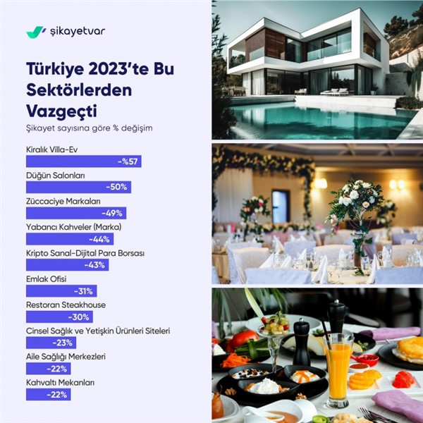 2023’te Türkiye’nin ekonomik ve sosyal koşulları gereği birçok alanda değişim yaşandı. Verilere göre geçtiğimiz yıllar ile kıyaslandığında yüzde 57’lik bir düşüşle şikayetlerin en çok azaldığı sektör kiralık ve villa sektörü oldu. Artan masrafların bir yansıması olarak düğün salonu şikayetleri yüzde 50 azaldı.
