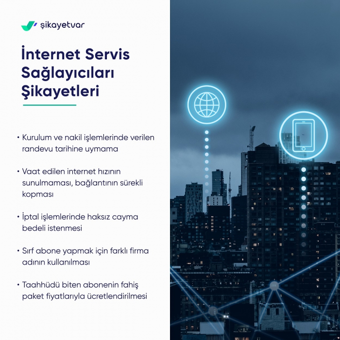 Kurulum ve nakil işlemlerinde verdiği randevu tarihine uymama, vaat edilen internet hızının sağlanmaması, bağlantı kopması ve internet arızalarının çözümü için yeterli desteği alamama, Taahhütte geçen hizmeti vermemesine rağmen iptal işlemlerinde haksız cayma bedeli yansıtma, sırf abone yapmak için farklı firma adının kullanılması, hatalı ve yanlış bilgilendirme yapılması ve sonrası oluşan sıkıntılarda bunun sorumluluğunun kabul edilmemesi.