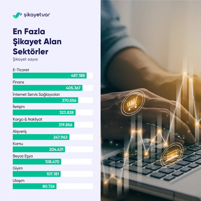 Şikayetvar verilerine göre 487 bin 188 şikayet sayısıyla geçmiş yıllarda olduğu gibi 2023’te de en çok şikayet e-ticaret sektörüne geldi. 405 bin 367 şikayet sayısıyla finans en çok şikayet edilen ikinci sektör olarak öne çıkarken, finans sektörünü sırasıyla internet servis sağlayıcıları (370 bin 556), iletişim (323 bin 828) ve kargo ve nakliyat (319 bin 856) takip etti.