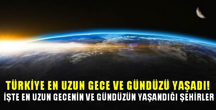 Türkiye’nin de içinde bulunduğu Kuzey Yarım Küre’de en uzun gece, en kısa gündüz yaşandı. Güneyden kuzeye gidildikçe gece süresi uzarken, kuzey kutup noktasında dün itibarıyla 6 ay gece yaşanmaya başlandı. Kuzey Yarım Küre’de kalan Türkiye’de ise, diğer şehirlere göre en uzun gündüzü Hatay, en uzun geceyi ise Sinop geçirdi.