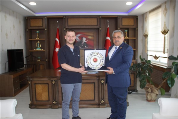 Başkan Aktürk, “ Sultan Alparslan Diyarı ecdadımızın ana vatanı Malazgirt ilçesinde bulunmaktan son derece mutlu olduğumu ifade etmek isterim. Tarihi ilçemizde ilk ziyaretimizi ilçe Kaymakamımız Sayın Yiğit Yaşar Demirer’i ziyaret ettik. Sayın Kaymakamımıza ilgi ve alakasından dolayı çok teşekkür ederim.” dedi.