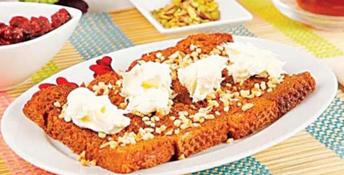 5 dilim esmer köy ekmeğini, büyüklüklerine göre üç ya da dört eşit parçaya bölün ve ısıya dayanıklı bir fırın kabına dizin. 2 su bardağı pekmezi, 1 su bardağı sıcak suyu ve 2 yemek kaşığı tereyağını sırasıyla geniş tabanlı bir tencereye aktarın. Tereyağı eriyene kadar orta ateşte kaynatın. Kaynattığınız pekmezi, fırın kabına yerleştirdiğimiz ekmek dilimlerinin üzerine gezdirin. Servis etmeden önce 1/2 su bardağı ince çekilmiş fındık içini serpiştirin. Servis tabağına aldığınız ekmek dilimlerini kaymakla süsleyerek bekletmeden servis edin. Afiyet olsun.